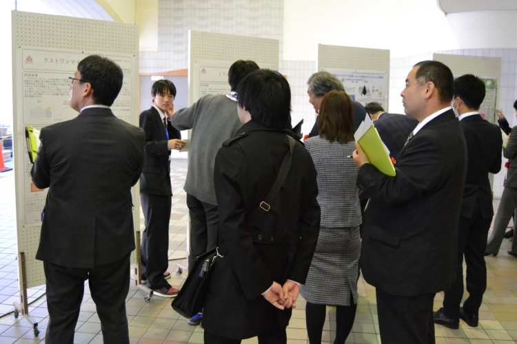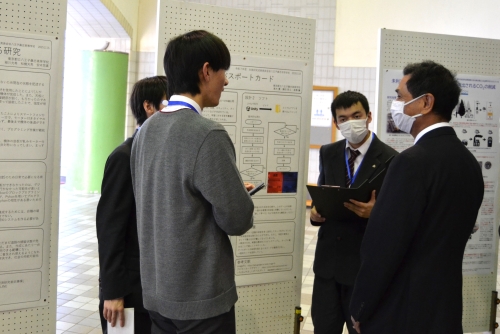 ポスター発表を行い、システム情報分野 3年 細川さん 松橋さん 安本さんのテーマ「ラストワンマイル」